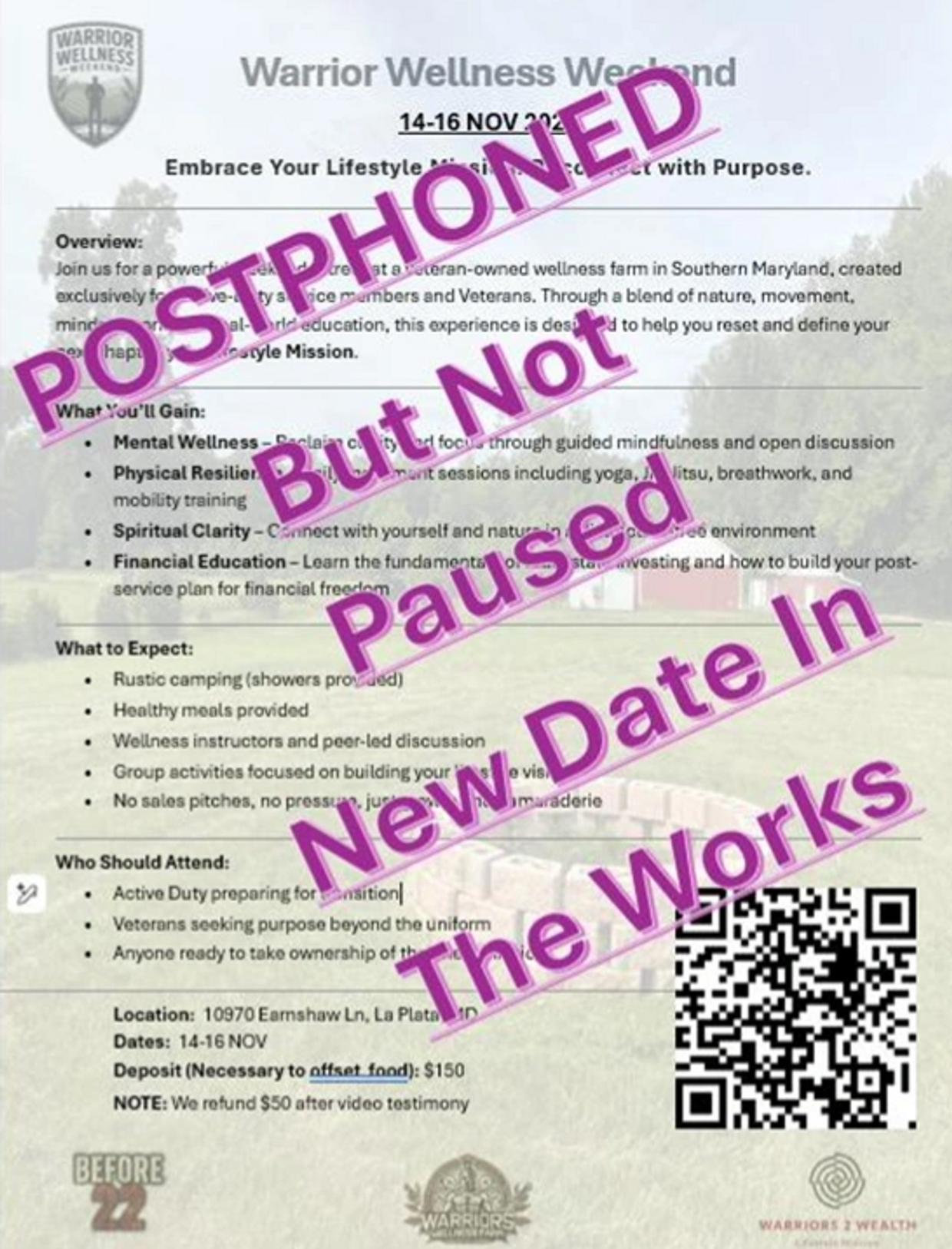 Warriors2Wealth has partnered with BRC and Warriors Wellness Farm to host the next Warrior Wellness Weekend, taking place November 14-16, for ten hand-selected Military Members and Veterans. This weekend is more than just camping — it’s a focused, purpose-driven mission to help those who served find clarity, community, and a renewed sense of direction.